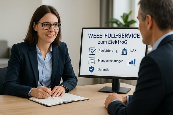 Wir beraten Sie kostenlos und unverbindlich. Buchen Sie jetzt einen 30 Minuten Beratungstermin. Im ersten Schritt schildern Sie uns was Ihr Unternehmen macht und im Anschluss erklären wir Ihnen inwieweit das ElektroG auf Ihr Unternehmen zutrifft und was Sie beachten müssen.